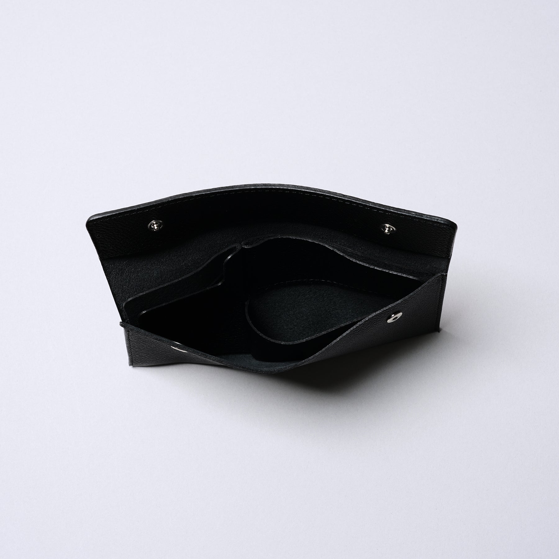 硬貨とカードの収納部を、互いに重なることにないように配置しました。収納時にも厚みが偏らず、かさばりにくいことが特徴です。カードの収納部には、それぞれ10枚程度のカードが収まります。すっきりとした外観と実用的な機能を両立した設計です。